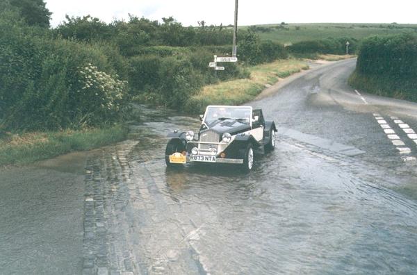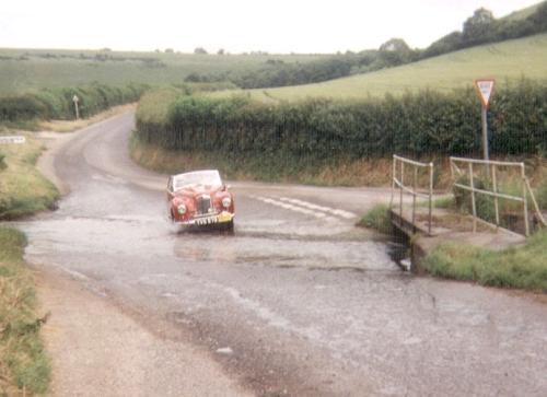 The run over Batcombe Down, afforded a glorious view over the village nestling beneath, to the typical unspoiled Dorset countryside. Turning then for Weymouth, the Cerne Abbas Giant was passed, to another ford. This proved no problem for Mr Hopkins in his 1953 Sunbeam Alpine.